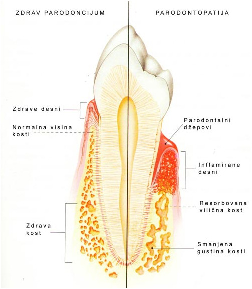 Parodontopatija predstavlja inflamatornu bolest koja zahvata desni, alveolarnu kost i druge strukture tzv. potpornog aparata zuba, a karakteriše se upalom desni (gingivitis) i povlacenjem desni, resorpcijom alveolarne kosti, parodontalnim džepovima i u terminalnoj fazi klaćenjem i ispadanjem zuba.